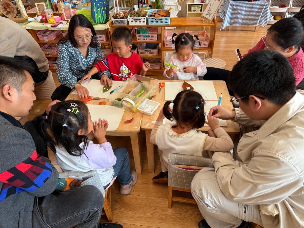 亲子游戏“绘玩时光--落叶跳舞”更是将活动推向了高潮。孩子们与家长一起,利用收集的落叶和手工材料,共同制作了落叶小人。通过绘本共读、灵感激发、示范讲解、亲子创作等环节,孩子们不仅锻炼了动手能力,还增进了与家长之间的亲子关系。作品展示与分享环节,孩子们自豪地展示了自己的作品,并与家长互相欣赏、夸赞,场面温馨而感人。