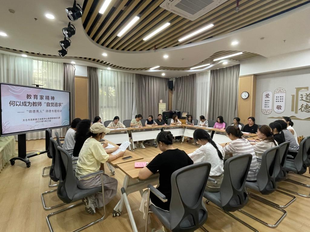 2025 年 9 月 22 日,太仓市高新区娄江幼教中心锦绣新城幼儿园举办 “锦德秀人” 专题培训,聚焦 “教育家精神何以成为教师‘自觉追求’” 主题。培训旨在落实相关文件要求,提升教师素养,推动教育家精神内化为教师行动准则。