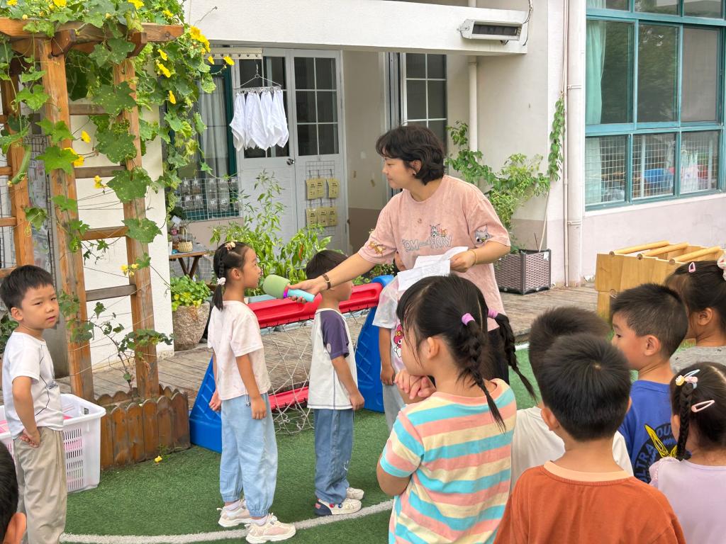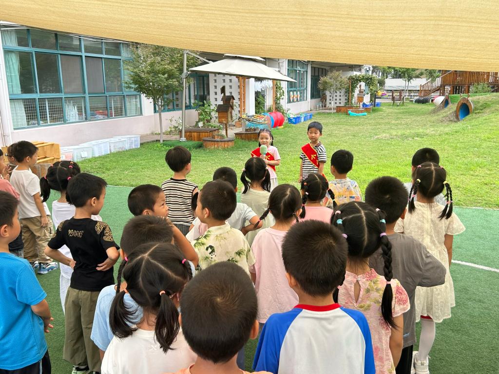 伴随着雄壮的《义勇军进行曲》,五星红旗冉冉升起,孩子们小脸上满是认真与庄重,纷纷行注目礼。来自大3班的小小升旗手们圆满完成了光荣的升旗任务。随后,大3班的董顾轩小朋友带来了歌曲《萤火虫》,他的歌声清亮,仿佛把大家带入了梦幻的夏夜;紧接着,顾晗小朋友演唱的《小美满》,用稚嫩又甜美的嗓音传递着满满的幸福感,赢得了在场师幼的阵阵掌声。