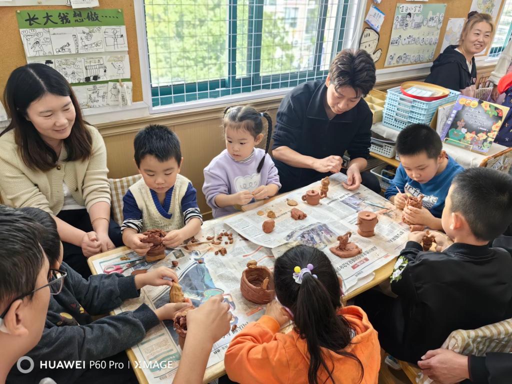 第三环节的亲子游戏,在温情互动中拉近家园距离。各班结合我园的绘本特色,设计了形式多样的“绘玩时光”互动游戏,让家长与孩子在合作中增进感情。大一班的“青花瓷绘画”亲子活动中,家长与孩子共同拿起画笔,在白色瓷盘上勾勒青花图案,一笔一划间,既有传统文化的熏陶,也有亲子合作的温馨;大二班的“戏曲发箍”制作现场,家长和孩子一起粘贴流苏、装饰水钻,一个个融入戏曲元素的发箍,成为亲子间独特的纪念;大三班则结合绘本故事,开展了“抢椅子”音乐游戏,随着欢快的旋律,家长与孩子围着椅子转圈,笑声、欢呼声此起彼伏,现场氛围热烈非凡;大四班的“陶泥制作”活动更是充满乐趣,家长与孩子一同揉捏陶泥,时而捏出可爱的小动物,时而塑出精致的小杯子,指尖的互动传递着满满的爱意。